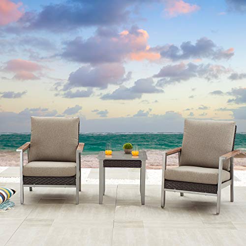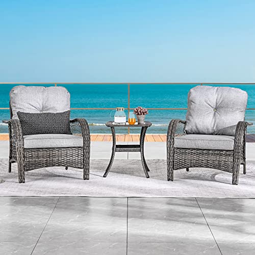 Festival Depot 3 Pieces Patio Bistro Set PE Wicker Armchairs Set of 2 with Tempered Glass Top Side Table Outdoor Furniture Conversation Set (Brown Wicker, Grey Cushion)