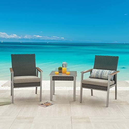Festival Depot 3 Pieces Patio Outdoor Bistro Set Wicker Sofa Armchairs Lounge with Seating Back Cushions Metal Side Coffee Table Garden (3pc Wicker Chair Sets, Gray)