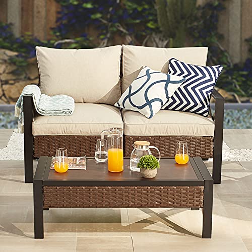 Festival Depot 3 Pieces Patio Furniture Set All-Weather Rattan Wicker Metal Frame Sofa Chair Outdoor Conversation Set Sectional Corner Couch with Cushions and Coffee Table for Deck Poolside