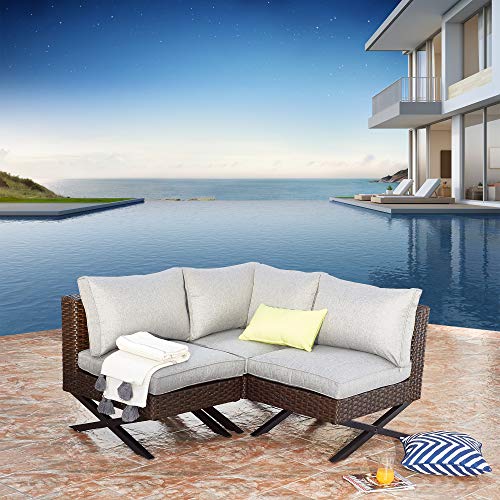 Festival Depot 3 Pieces Patio Conversation Set Sectional Corner Sofa Combination X-Shaped Legs Outdoor All-Weather Wicker Metal Armless Chairs with Seating Back Cushions Garden Deck Poolside
