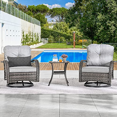 Festival Depot 3 Pieces Patio Bistro Set PE Wicker 360-Degree Swivel Chairs Set of 2 with Tempered Glass Top Side Table Outdoor Furniture Conversation Set (Brown Wicker, Grey Cushion)