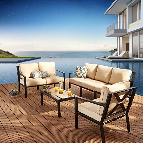 Festival Depot 7 Pieces Patio Outdoor Furniture Conversation Sets Loveseat Sectional Sofa, All-Weather Black Slatted Back Chairs with Coffee Table and Thick Soft Removable Couch Cushions (Beige)