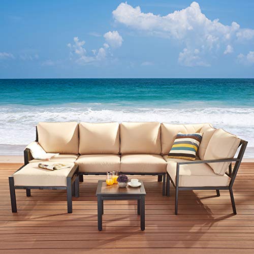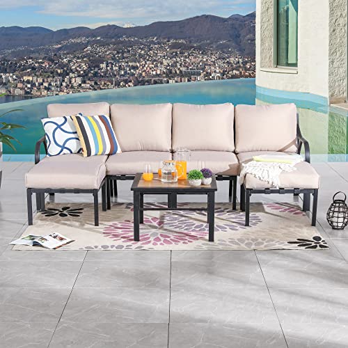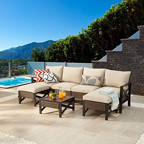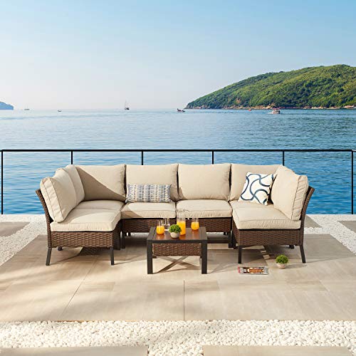 Festival Depot 7 Pcs Patio Conversation Set Sectional Chair Ottoman with Cushions and Coffee Table All Weather Outdoor Furniture for Deck Garden, Beige