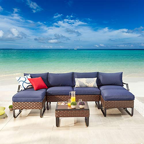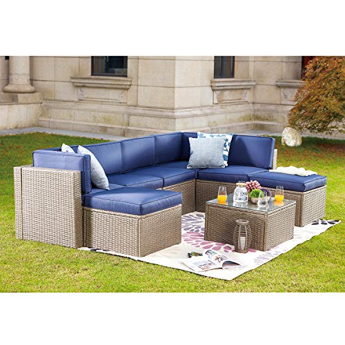 Festival Depot 7 Pieces Patio Conversation Sets Outdoor Furniture Sectional Sofa, All-Weather PE Rattan Brown Wicker Back Chair with Coffee Table, Ottoman and Thick Soft Removable Couch Cushions(Blue)