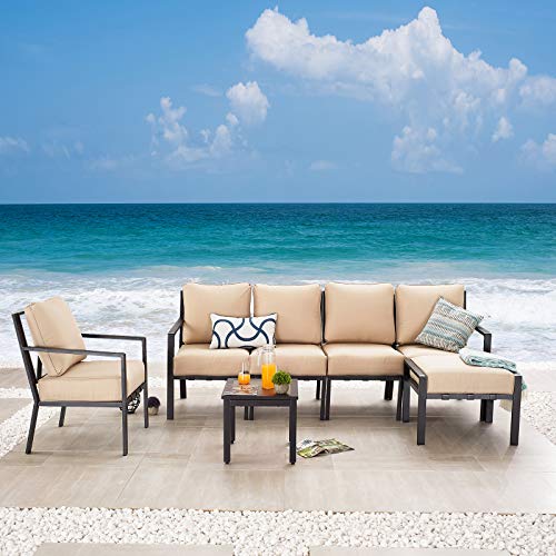 Festival Depot 7-Pieces Patio Conversation Sets Outdoor Furniture Loveseat Sectional Corner Sofa, All-Weather Black Slatted Back Chairs with Coffee Table and Soft Removable Couch Cushions(Beige)