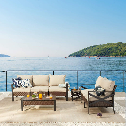 Festival Depot 4 Pcs Patio Bistro Sets Outdoor Arbitrary Combination Conversation Furniture with 1 3-Seats Sofa 2 Dining Armchairs and 1 Coffee Table for Bar Indoor Home Garden Pool Porch (Beige)