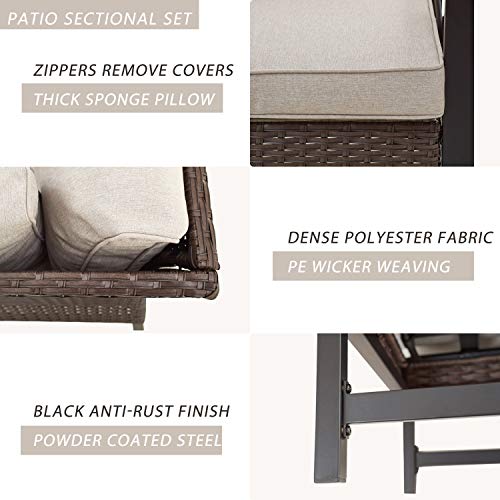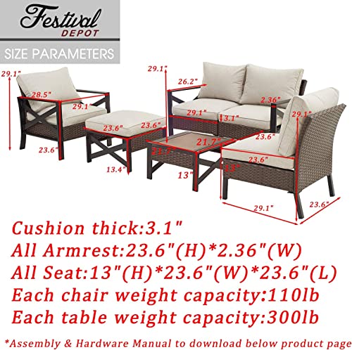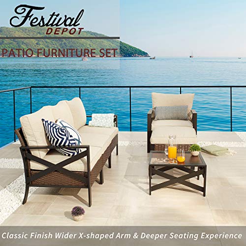 Festival Depot 6pc Patio Conversation Set Sectional Corner Sofa Set Outdoor All-Weather Wicker Metal Chairs with Seating Back Cushions Side Coffee Table Ottoman Garden Poolside