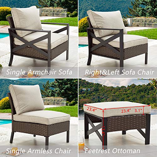 Details: This set is fully covered with PE wicker, which is durable and water resistant, weather resistant and easy to clean. The visual effect resembling natural rattan makes people feel as comfortable as being in nature. The thick water-resistant seat cushions brings people a comfortable sitting and lying experience. It is a best choice for garden and backyard get-together. Set includes: 2 armless sofa chairs, 1 Armchair,2 corner sofa with seat and back cushions,1 coffee table Powder-coated steel frames and Polyester fabrics All-weather PE wicker cover blend with durable metal frames Use as separate or adjust required combinations Deep seating with comfortable zipped cushionsDimensionArmchair:27.4"(W) x 31.5"(D) x 25.8"(H)Corner Chairs : 27. 6"(W) x 27.6"(D) x 25.8"(H)Armless Chair:23.6"(W) x 27.4"(D) x 25.8"(H)Coffee Table:23.6"(W) x 23.6"(D) x 13.3"(H)Ottoman:23.6"(W) x 23.6"(D) x 13.3"(H)Cushion:3.1"ThickArmchair:27 lbRight and Left Corner Chair Weight:24 lbArmless Chair Weight:20 lbOttoman:13 lbsSide Table:18 lbDetailsAssembly Required :YesChair Type: Corner Chair;SofaCushion and Pillow Features:UV Resistant,Water ResistantFabric Type:Polyester-BlendFill Material:PolyesterFrame Finish:Powder-coatedFrame Material:SteelIncluded:Cushions Included,Hardware IncludedPatio Furniture Features:Arms,Removable Cushions,Weather&rust resistantWeight Capacity (lb.):300 lb