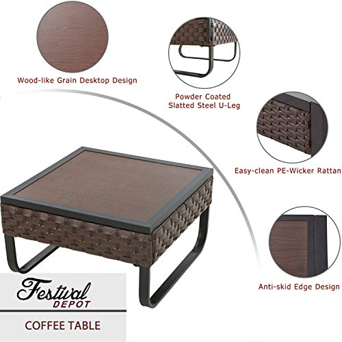 Festival Depot Coffee Outdoor Dining Furniture Bistro Side Patio Table Square Wicker Rattan Wood Grain Desktop with Side U Shaped Slatted Steel Leg Lawn Garden All Weather 23.6"(L)*23.6"(W)*13.7"(H)